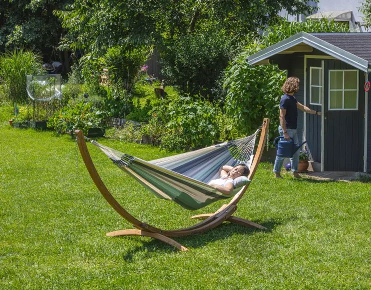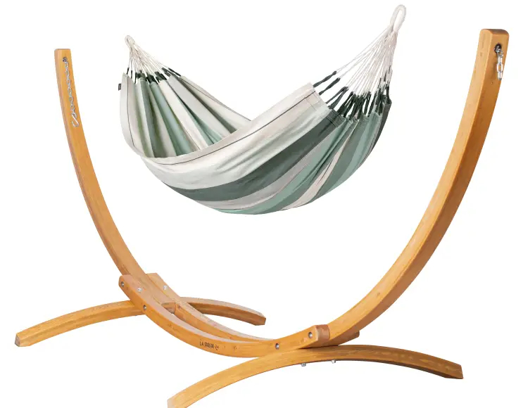 Les couleurs du hamac ULIVO rappellent les couleurs des oliviers, avec des rayures vertes dans différentes nuances et du beige.